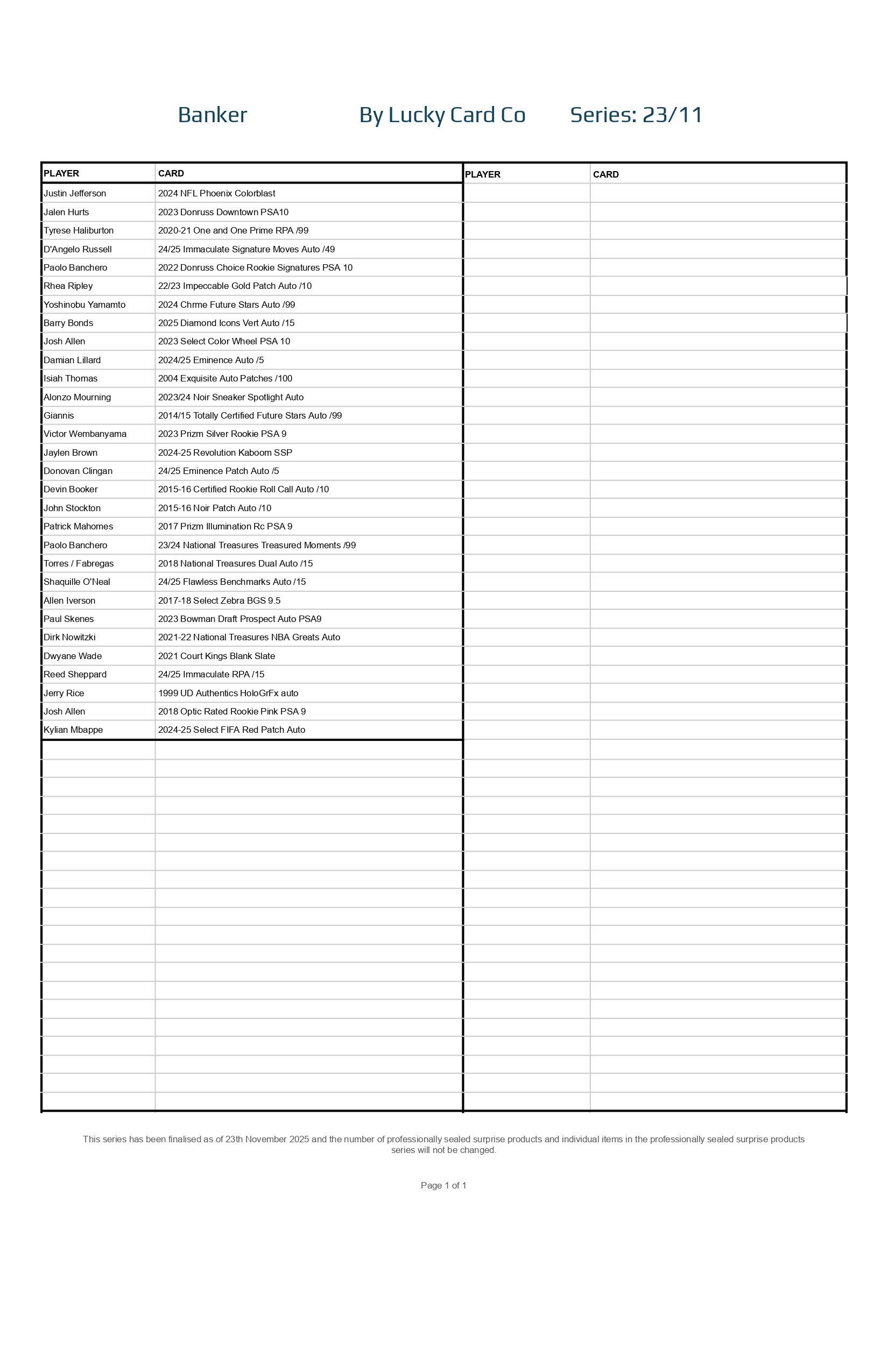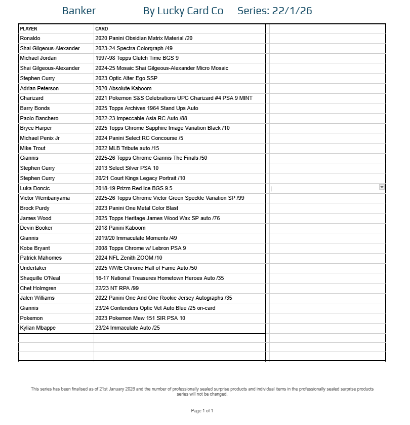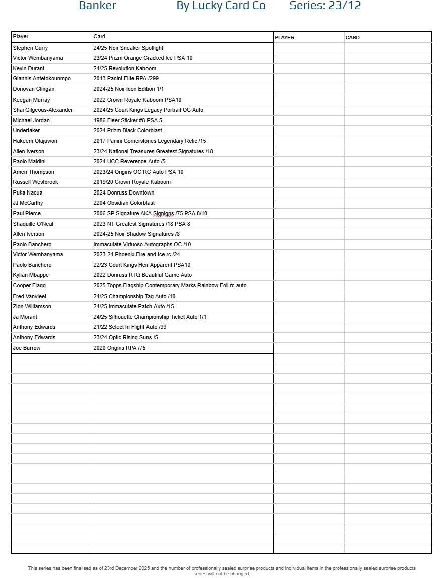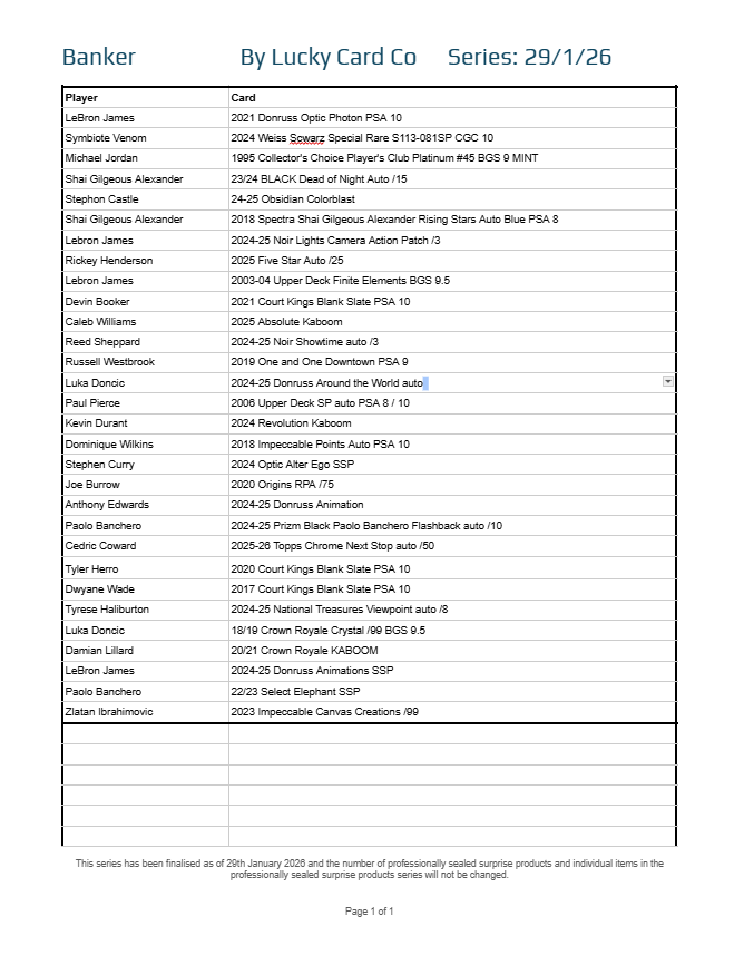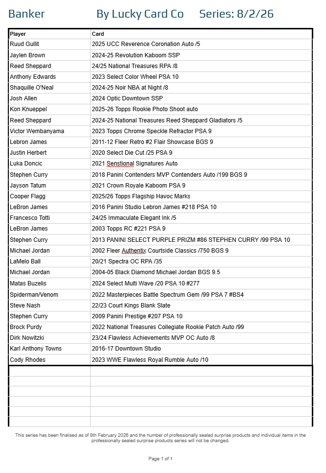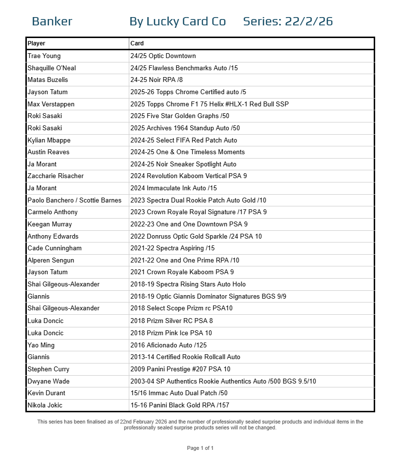 Each Series is built from a finalised checklist, divided into the same 30-spot structure used across all Lucky Card Co multisport products: