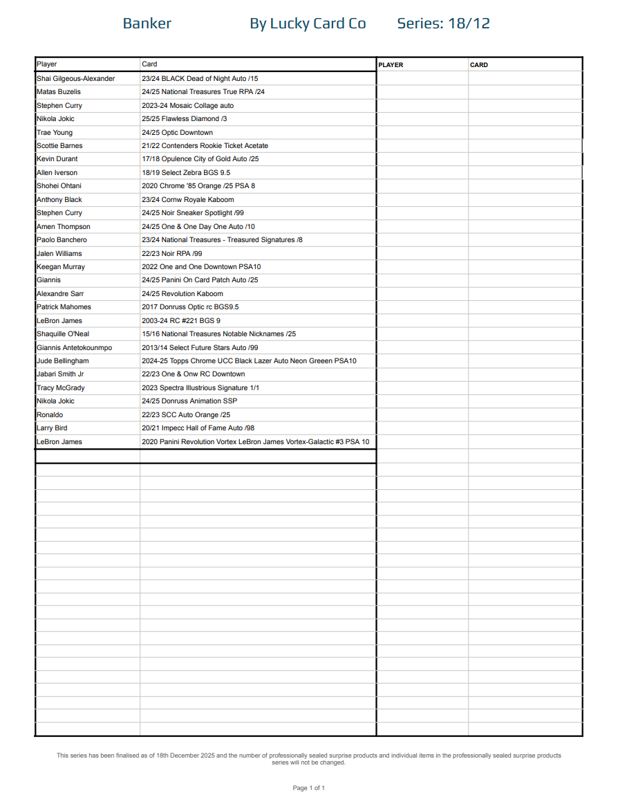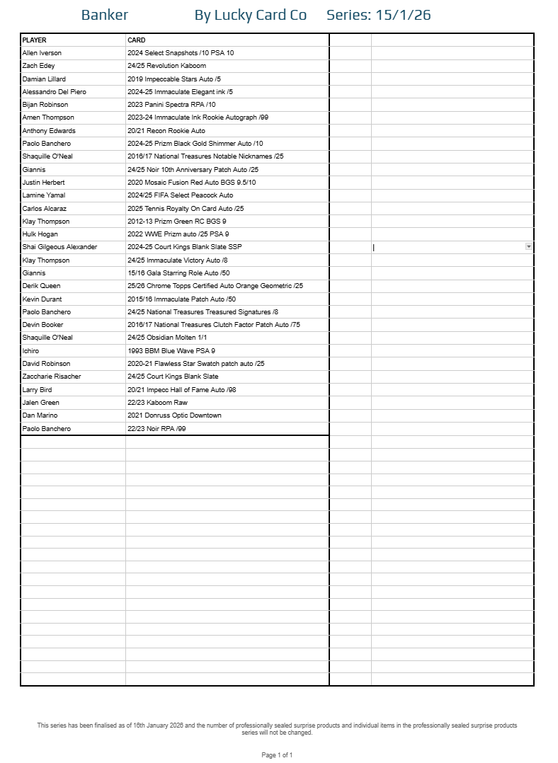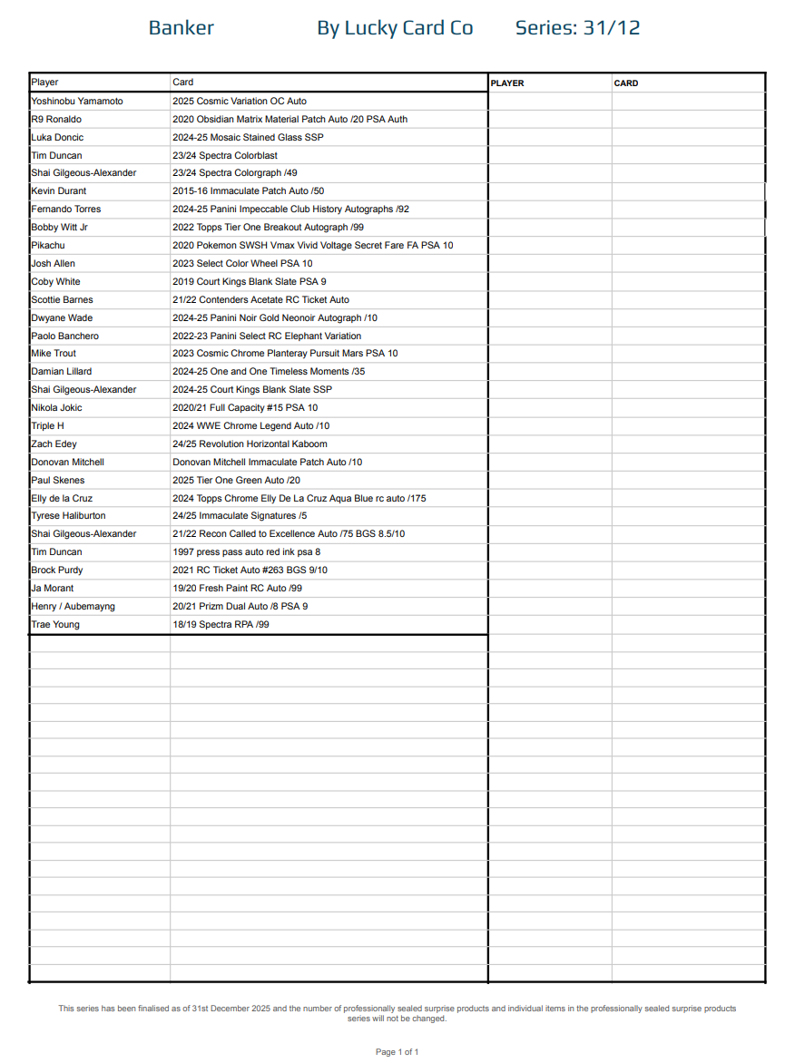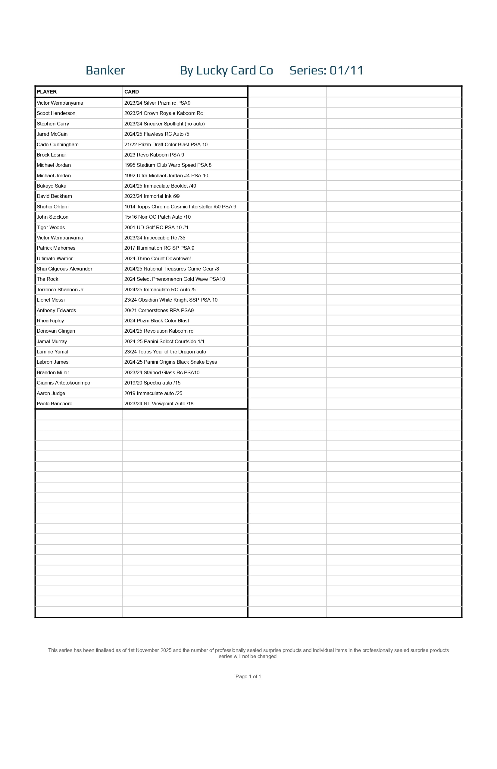 Each Series is built from a finalised checklist, divided into the same 30-spot structure used across all Lucky Card Co multisport products: