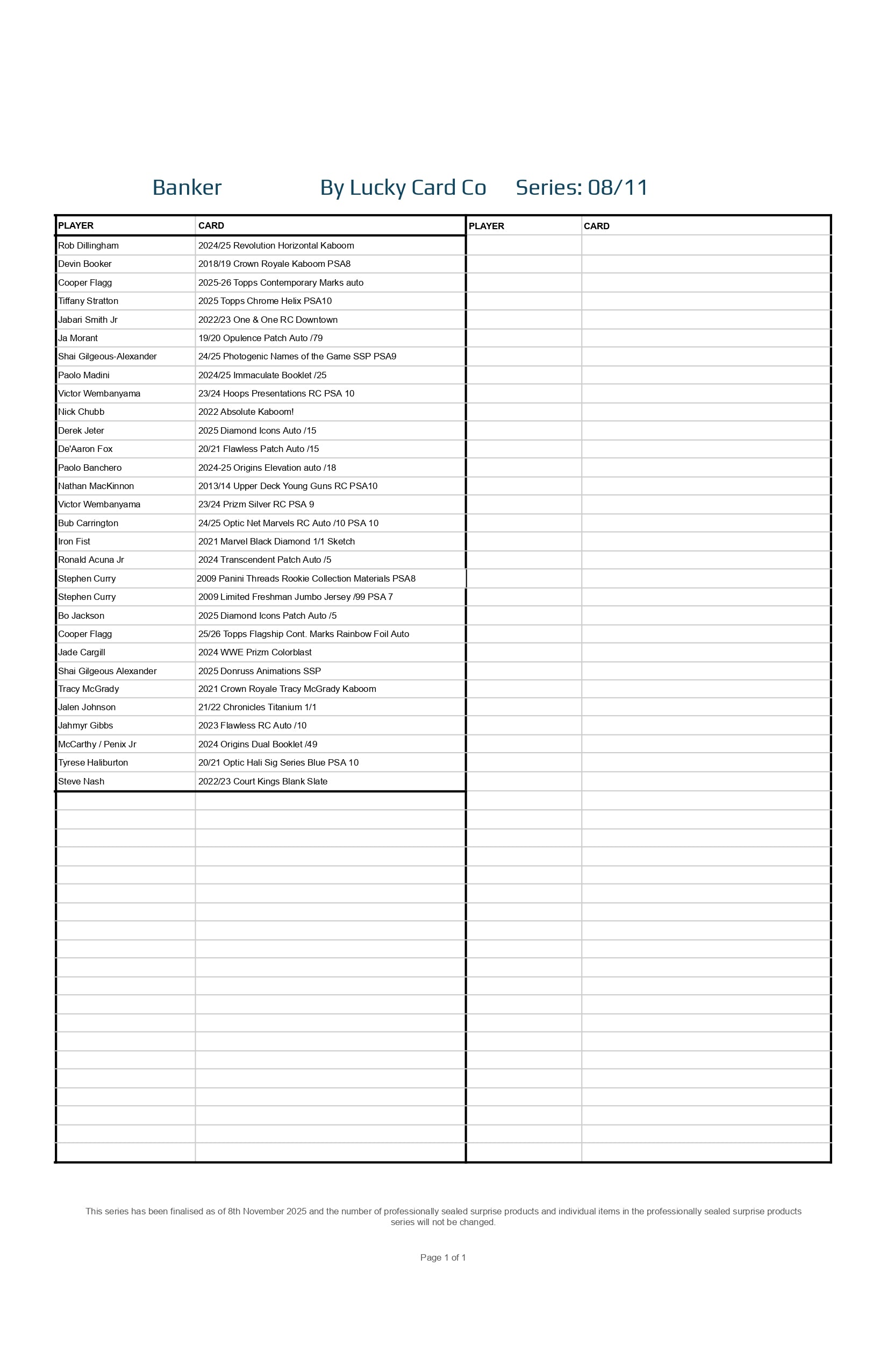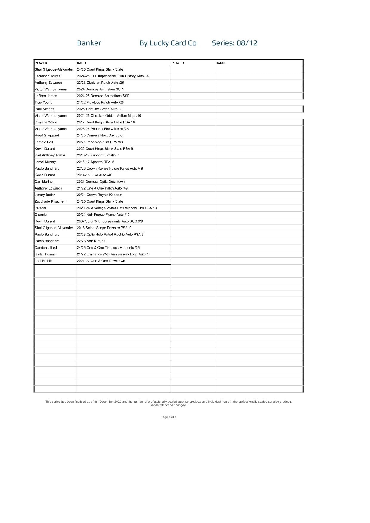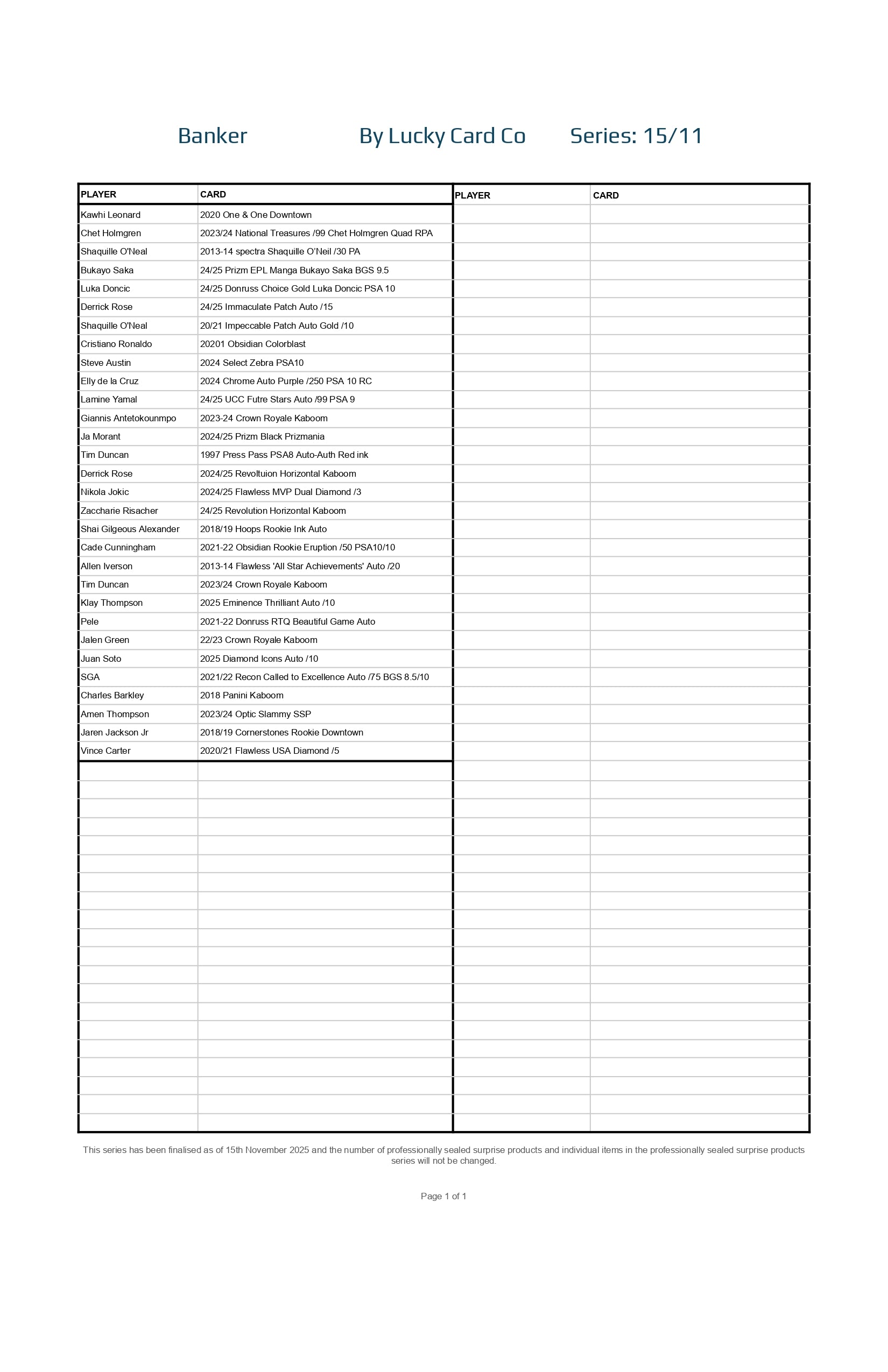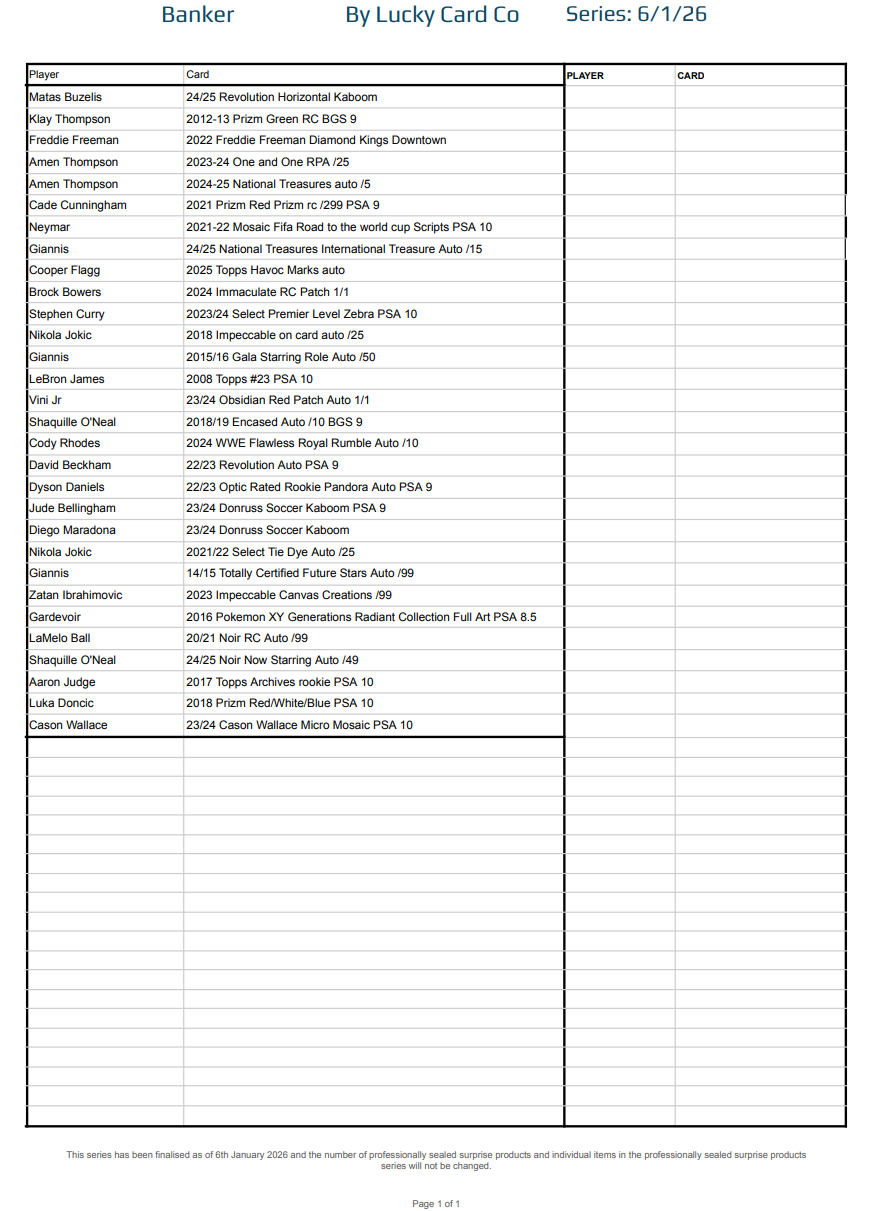 Each Series is built from a finalised checklist, divided into the same 30-spot structure used across all Lucky Card Co multisport products:
